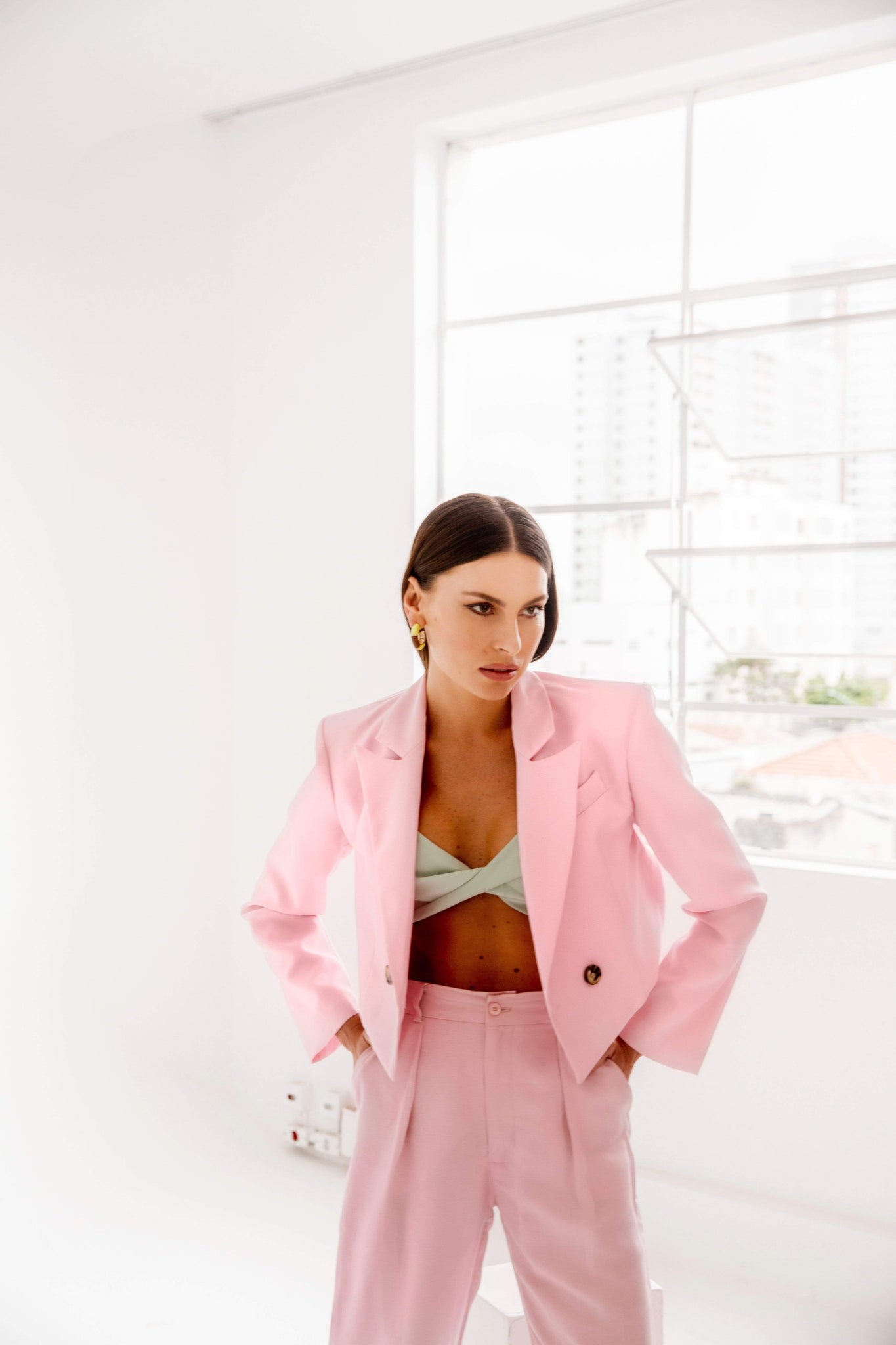 O Blazer Cropped é confeccionado em Alfaiataria, forrado em seda com botões frontais possibilitando o transpasse.